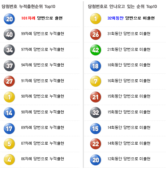1번외에도 26번, 42번은 최근 20주이상 당첨번호 나오지 않고 있는 번호들입니다.